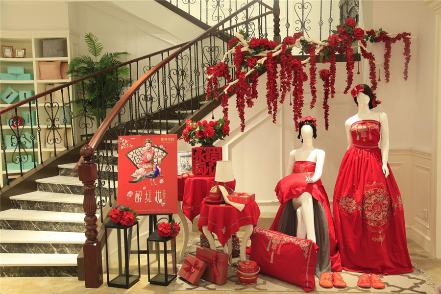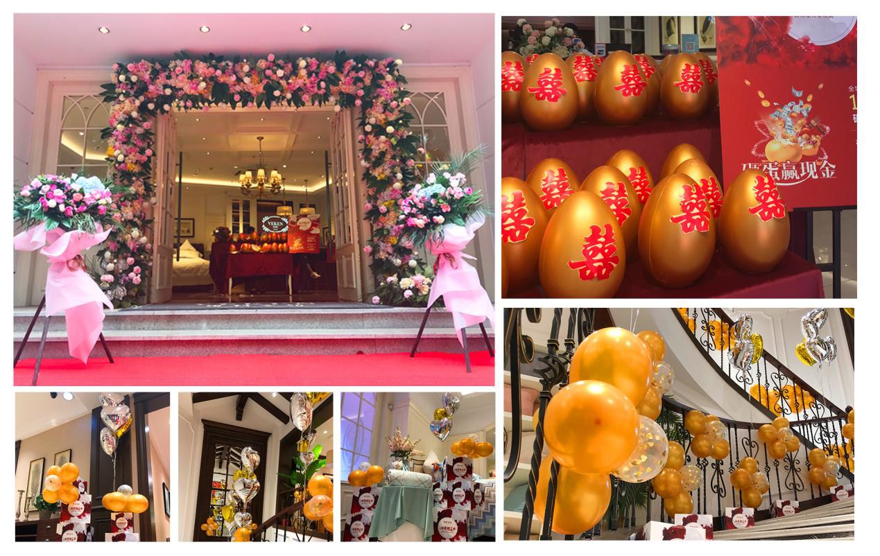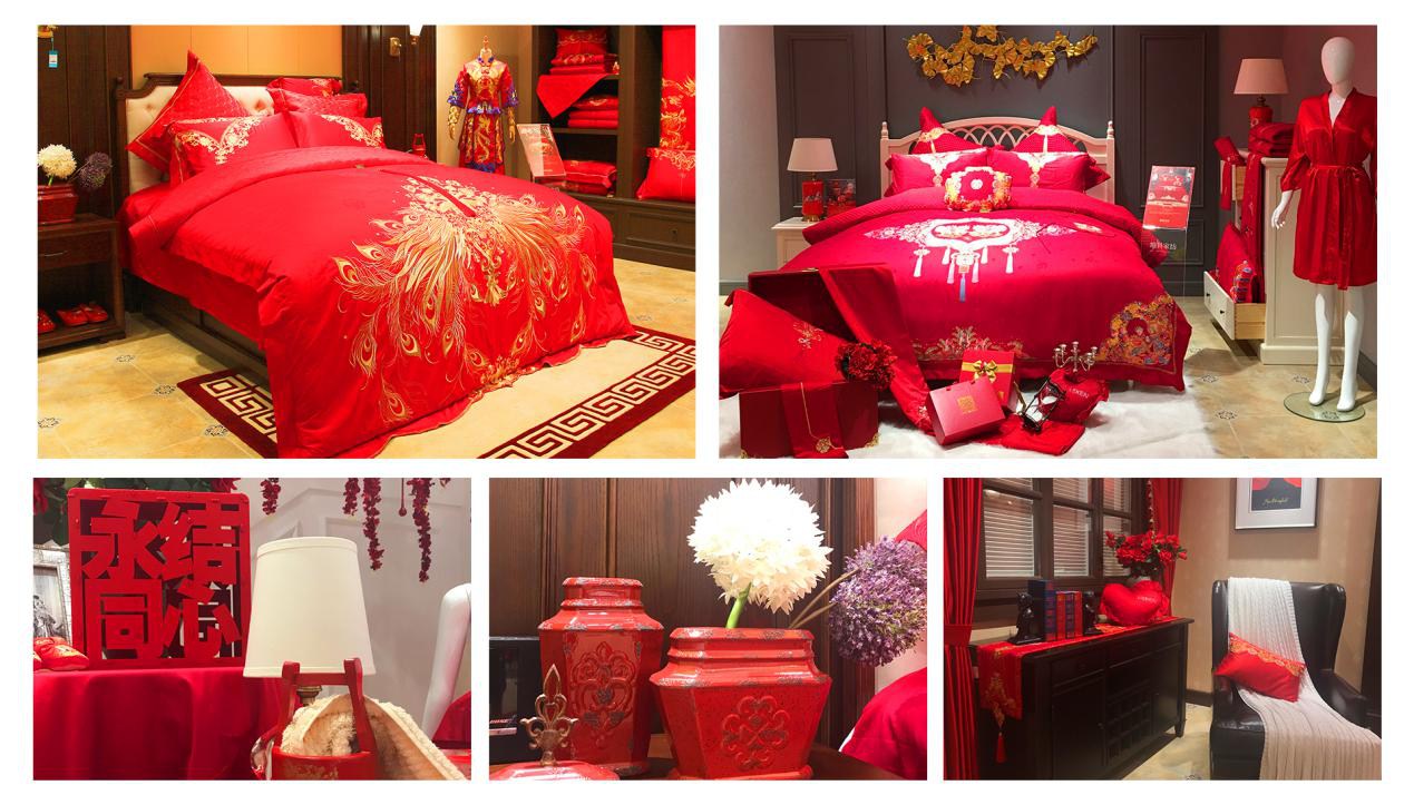 為帶給顧客更直觀舒適的消費(fèi)體驗(yàn),在空間設(shè)計(jì)上,維科家紡和義店二樓婚慶家紡場(chǎng)景展示區(qū)摒棄了家紡行業(yè)傳統(tǒng)高柜+展床的方式,將300余平的空間分隔成7個(gè)實(shí)景樣板間,真實(shí)體現(xiàn)婚慶床品在日常家居生活中的效果,也能滿足顧客在選購(gòu)婚慶床品的同時(shí),一站式解決對(duì)婆婆禮、長(zhǎng)輩禮以及婚慶小件(子孫桶、火銃、虎頭鞋等)的需求。由于該創(chuàng)意目前在家紡行業(yè)中應(yīng)用較少,可借鑒之處寥寥無幾,公司各部門投入了大量的時(shí)間精力不斷對(duì)方案進(jìn)行修改,力求盡善盡美。整個(gè)二樓還設(shè)置了一大一小兩個(gè)洽談區(qū),都配備了舒適的沙發(fā)以及精致的茶歇,以供顧客能夠坐下來向?qū)з?gòu)詳細(xì)了解床品的信息。在陳列布置上,當(dāng)季新品醉紅妝、子孫滿堂、胭脂醉,熱銷品百子納福、麒麟賀滿堂等都被直接鋪設(shè)于房間內(nèi),并搭配生活化的情景道具,供顧客選購(gòu)。