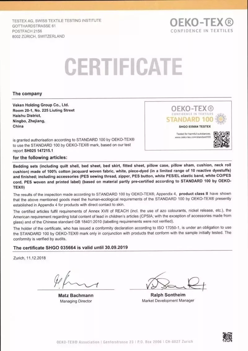 該證書(shū)標(biāo)簽適用產(chǎn)品為:床上用品(被套、床單、床圍、靠墊套、護(hù)頸套)由白色、經(jīng)匹染(染料的適用范圍僅限于已申報(bào)的10支活性染料)和后整理的全棉提花梭織面料制成;輔料包括(滌綸縫紉線(xiàn)、拉鏈、滌綸紐扣、白色滌綸/氨綸松緊帶、白色滌棉抽繩、滌綸織標(biāo)和印標(biāo))(部分使用有STANDARD 100 by OEKO-TEX證書(shū)的原材料)。