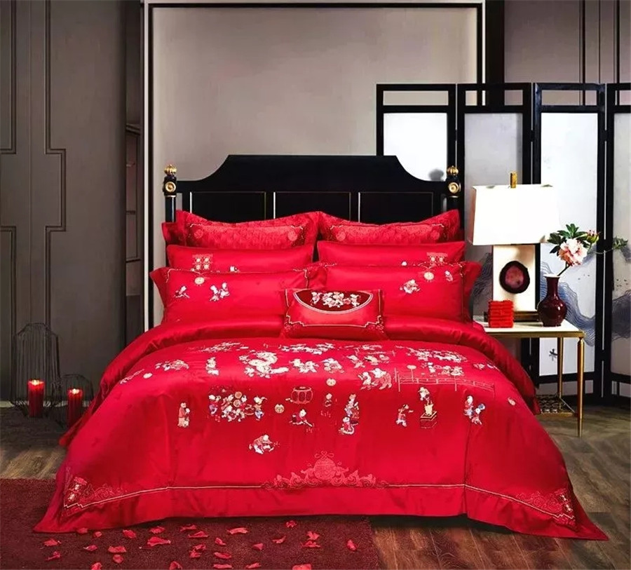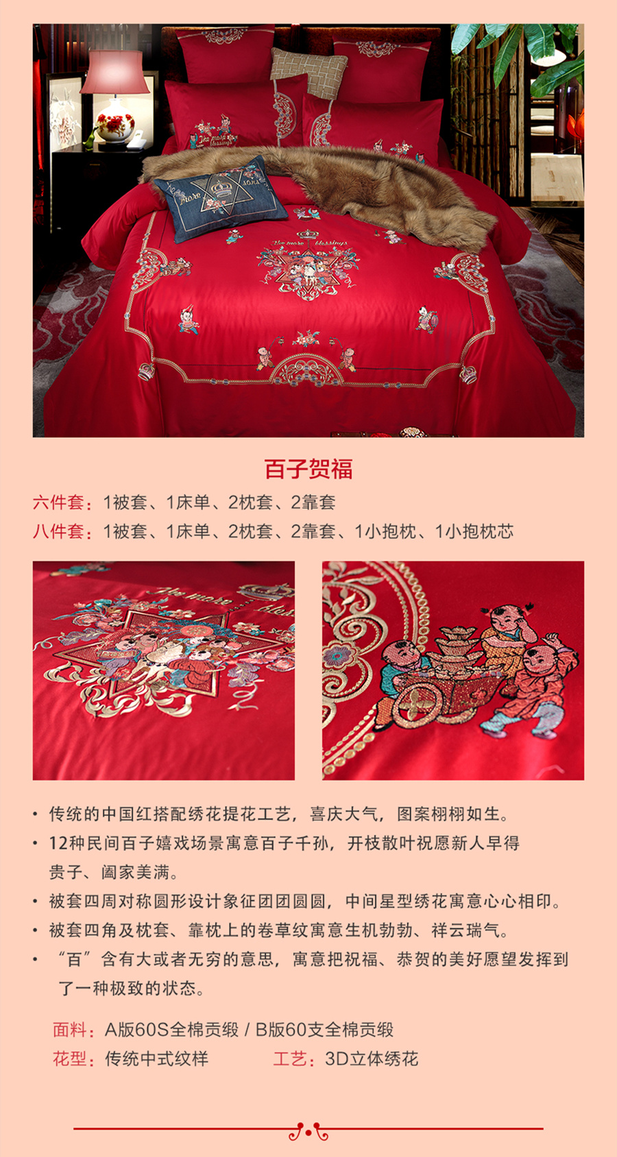 中國紅是中國人結婚必須的顏色,結婚當天一定需要鋪一套紅色的床品,即鎮(zhèn)宅也象征新人從此紅紅火火幸福美滿。